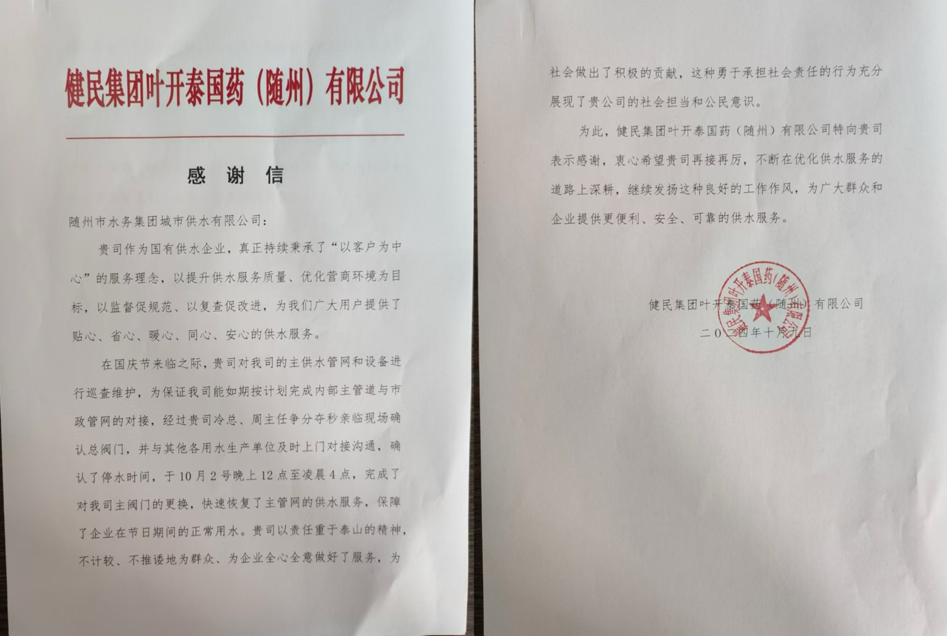 “排憂解難及時(shí) 供水服務(wù)周到”,近日,健民集團(tuán)葉開泰國藥(隨州)有限公司專程到隨州市水務(wù)集團(tuán)下屬子公司城市供水有限公司送上一面承載誠摯謝意的錦旗和一封感謝信,他們用最質(zhì)樸、最真摯的方式,對公司運(yùn)維人員熱情、高效、便捷、暖心的服務(wù)表示誠摯感謝。