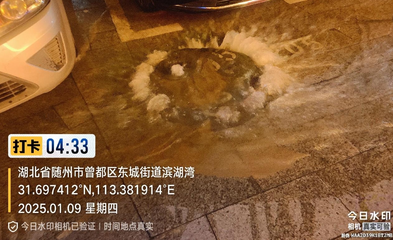 1月9日凌晨4時,隨州水務熱線電話驟然響起?!盀I湖灣小區(qū)門口水管破裂,水一直在往外冒!”電話那頭,群眾焦急的聲音傳來。這通熱線,如同戰(zhàn)斗的沖鋒號,城市供水公司運維中心工作人員迅速響應,在接到指令的第一時間,便迎著刺骨的寒風奔赴現(xiàn)場。