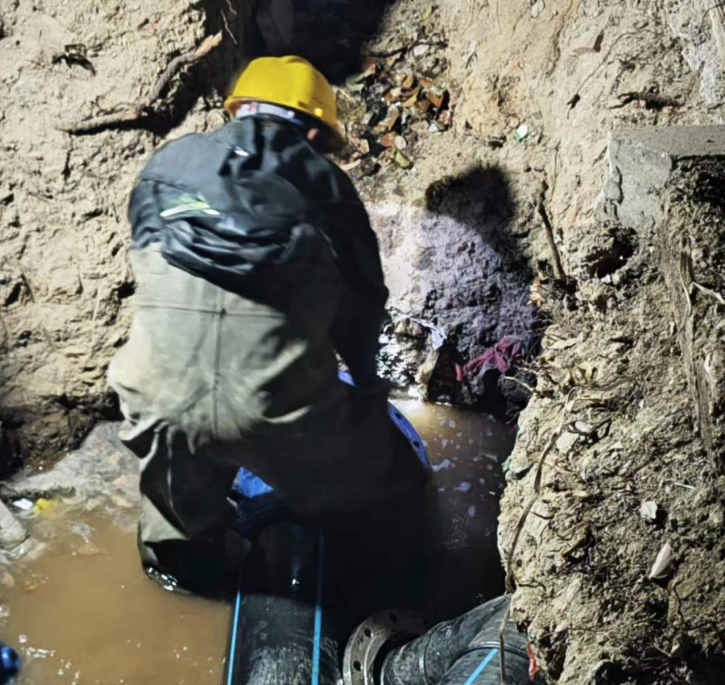 “末端”不末尾,問題不過夜。欣和電子位于高新區(qū)供水管網(wǎng)最末端,周邊聚集了多家24小時連續(xù)生產(chǎn)的企業(yè)。廠區(qū)用水報裝需在DN200管網(wǎng)破口接水,新安裝DN100機械表,既要穿越車流滾滾的主干道,又不能影響“鄰居”們一滴水的正常供應(yīng)。接到求助后,水務(wù)集團建設(shè)工程公司立即啟動“高新企業(yè)用水綠色通道”,青年突擊隊成員10分鐘集結(jié)完畢,技術(shù)骨干連夜踏勘現(xiàn)場。