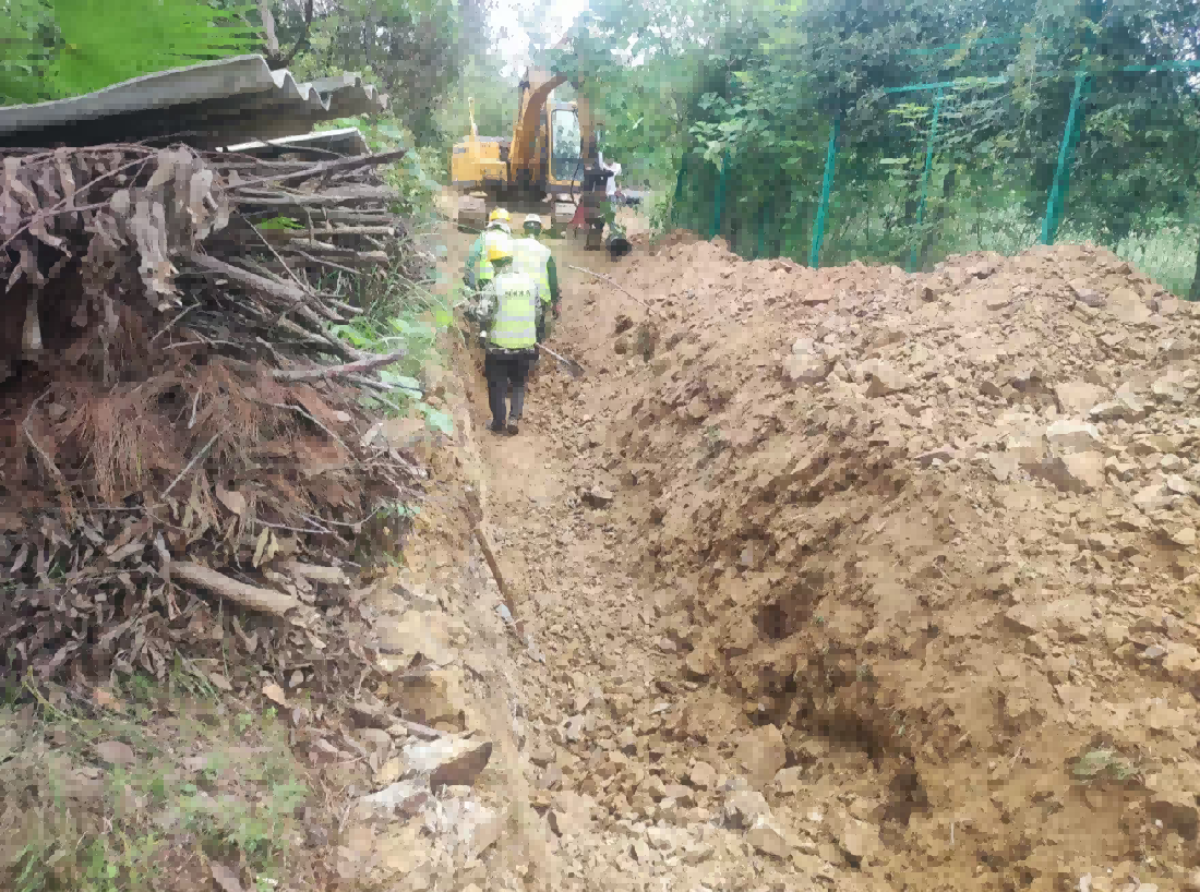 機電學(xué)校DN250球墨管供水工程線路處于山地丘陵地帶,沿線涉及鄉(xiāng)村道路、開墾菜園、陡峭山體等多重地質(zhì)和復(fù)雜環(huán)境考驗。在沿機電學(xué)校圍墻邊緣鋪設(shè)鄉(xiāng)村道路與圍墻之間不足3米的狹窄空間,成為施工線路上的“攔路虎”,道路是周邊居民日常出行的主要通道,一旦長時間阻斷,將嚴(yán)重影響群眾生活。項目部與學(xué)校和村委共同研討下,最終確定利用2天時間,集中突擊調(diào)用多臺設(shè)備,全力沖刺,快速施工完成后復(fù)路于民,順利啃下硬骨頭。