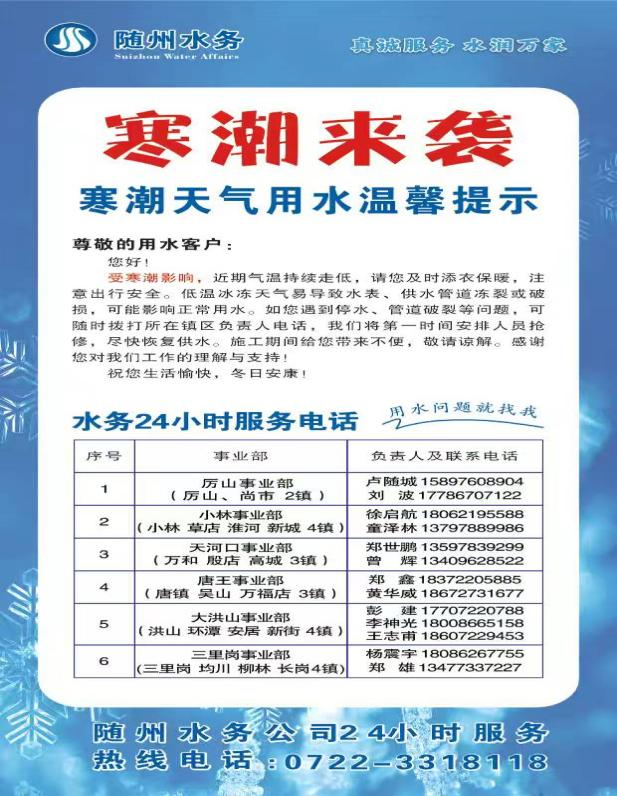近期,我市持續(xù)遭遇低溫寒潮,嚴(yán)寒天氣對(duì)城鄉(xiāng)供水管網(wǎng)及設(shè)施構(gòu)成嚴(yán)峻挑戰(zhàn),水務(wù)集團(tuán)隨縣供水公司迅速激活應(yīng)急響應(yīng)機(jī)制,提前部署筑防線、精準(zhǔn)服務(wù)解民憂、全員堅(jiān)守保暢通的硬核舉措,切實(shí)保障居民冬季用水無憂。