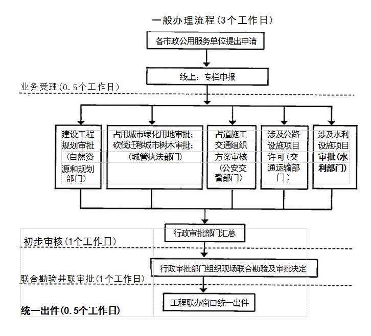 并聯(lián)審批辦理總時限:告知承諾制項目無需批前審批,由城 管、交通、公安審批部門加強現(xiàn)場實施監(jiān)管;一般審批項目3個 工作日(不含方案和評價報告編制時間、方案評審時間、申請人修改、審批前公示或公證時間)。